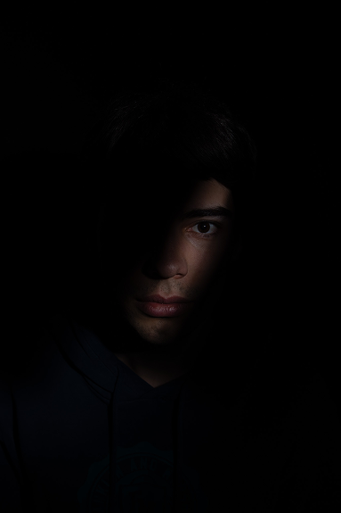Pour ce portrait, la photo a été réalisée en laissant le visage dans l’ombre, à l’exception d’une fine ligne éclairée qui en dessine la forme, comme un pochoir lumineux dans l’obscurité.