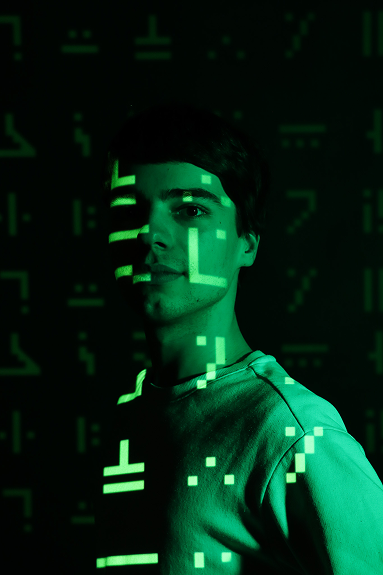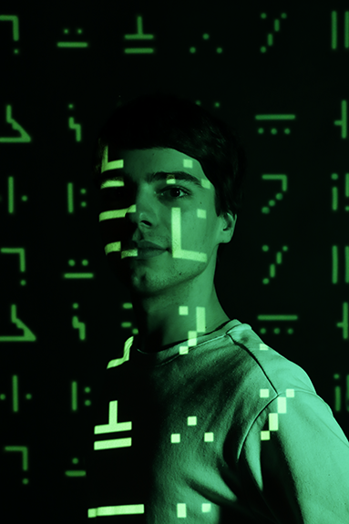 Ce portrait visait à se démarquer d’un portrait professionnel classique. Le choix s’est porté sur l’utilisation de signes et de formes abstraites inspirés du jeu Minecraft, tout en jouant avec la position de ces derniers pour créer une composition originale.