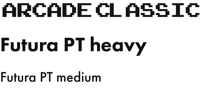 L’association de la typographie Arcade Classic et de Futura PT crée un dialogue entre rétro et modernité. La première, avec son style pixelisé, évoque l’esthétique des jeux d’arcade des années 1980, tandis que la seconde, géométrique et épurée, apporte lisibilité et équilibre visuel. Ce contraste souligne la rencontre entre nostalgie vidéoludique et design contemporain.